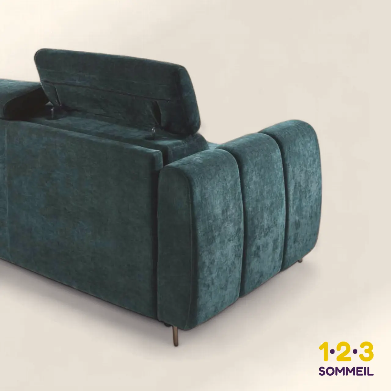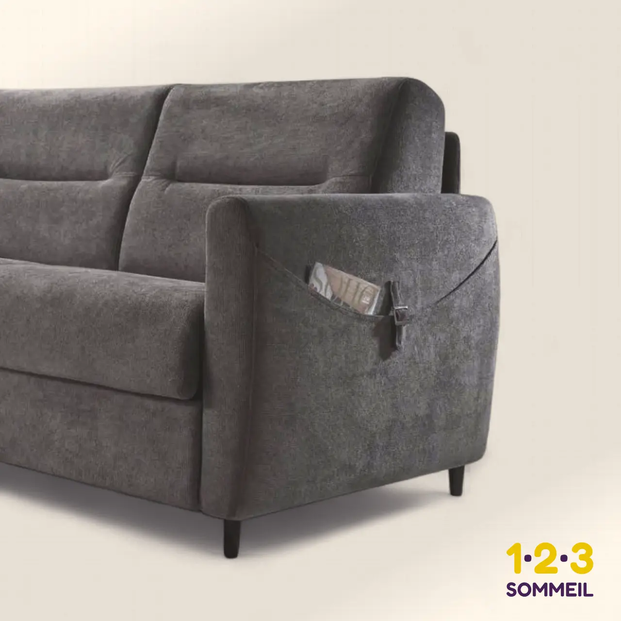 Le canapé-lit JADE est un modèle aux lignes contemporaines et vivantes, enrichi par les surpiqûres du dossier et les sangles décoratives des bras qui en font un compartiment de rangement pratique.